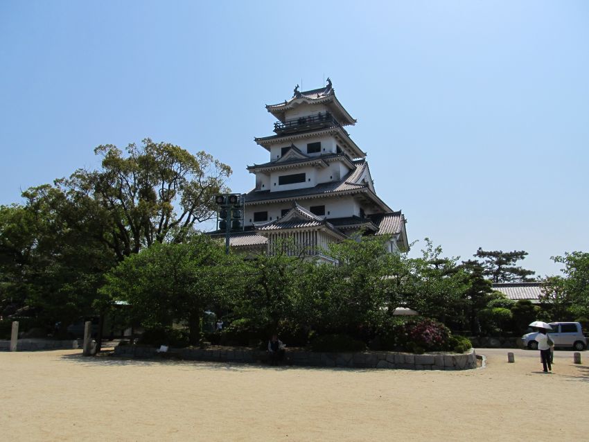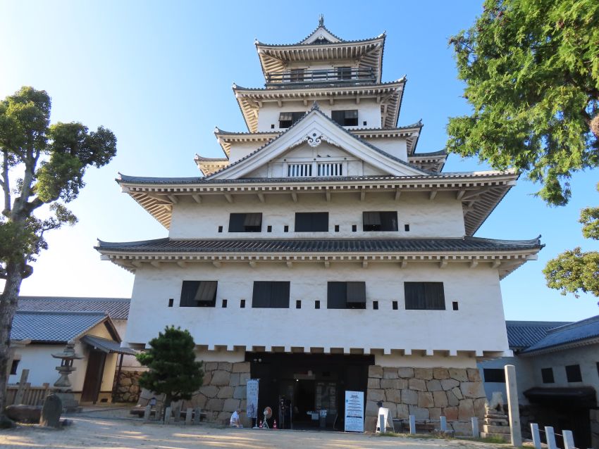 | 今治城は築城の名手・藤堂高虎が瀬戸内海に面した海岸線に築いた大規模な平城で、海水を引き入れた三重の堀や港(船入)などを備えた日本屈指の海城だった。他の城より格段に広い堀には海水を引き入れ、潮の干満によって海水の入れ替えが行われるようになっていた。 高虎は今治城を大規模な海城として築いた以外にも当時としては画期的な枡形の多用や層塔型天守の採用など行い、その後の城郭普請に大きな影響を与えた。 明治維新後に建造物のほとんどが取り壊されたため、内堀と本丸、二の丸、石垣などを残すのみとなったが、近年天守の他、櫓4基が復興されている。堀の外から天守を含め櫓、石垣を見ると海城らしいなかなか美しい姿を見せてくれるお城である。また今治城は、高松城と中津城とともに日本三大水城の1つにも数えられている。 |