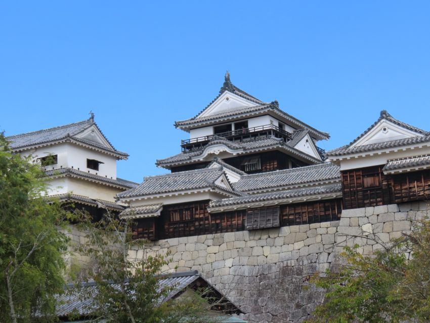 | 伊予松山城は松山平野中央部にあり、勝山(標高132m)の山頂に本丸がある連立式天守の平山城である。姫路城、和歌山城とともに日本三大平山城のひとつに数えられている。山頂に本丸、中腹に二之丸、山麓に三之丸を整備した広大な規模の城郭である。天守は安政元年(1854)再建と全国に12ある現存天守の中で一番新しいがその姿は重厚で美しい姿を見せてくれる。天守の他にも20棟が国の重要文化財に指定され、戦災や不審火で失われた建造物も木造で多く復元されている。また天守曲輪、本丸、二之丸の石垣がほぼ完全に残っており当時の縄張りもほぼそのままで、非常に見所の多い全国でも屈指の名城である。 この城は観光用でロープウェイかリフトで本丸まで一気に行くことができ、そちらから登る人が非常に多いが、無料駐車場もある二之丸史跡庭園の下から登るのが城好きにはおすすめである。 |