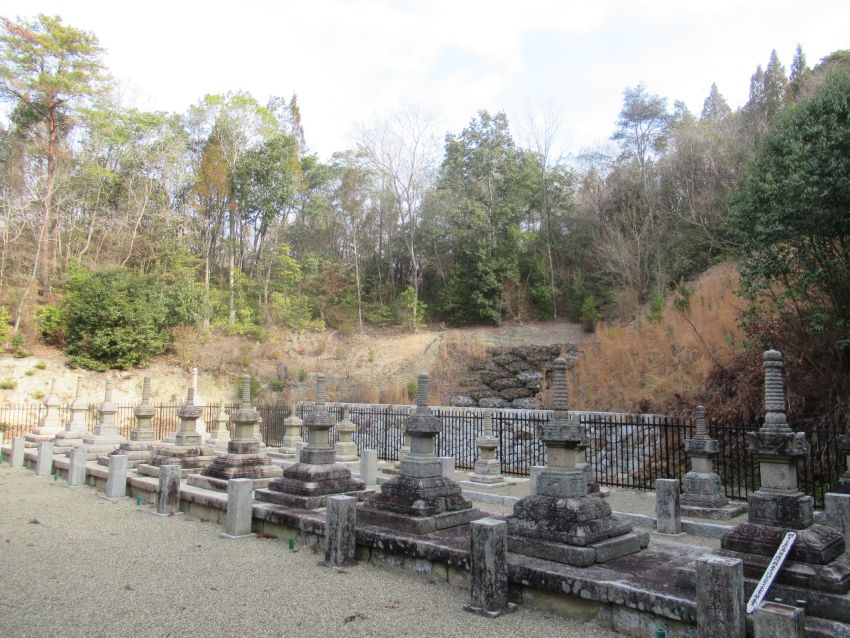 ![]() 20基の宝篋印塔(ほうきょういんとう) 歴代沼田小早川家当主の墓などが二列並び、前列一番右側が小早川隆景の墓 |